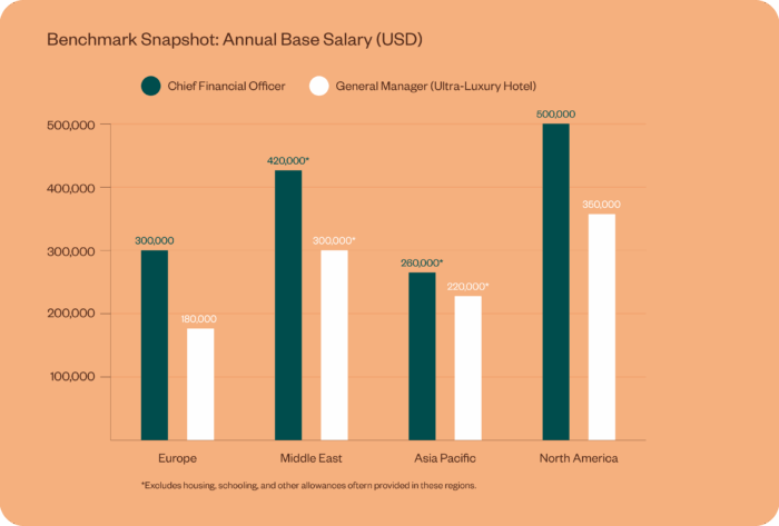 This fragmentation has profound effects on how leaders are paid. Compensation packages vary wildly by geography and role, reflecting both fierce global competition for talent and local market nuances. A luxury hotel company can’t copy-paste a Wall Street pay scheme and expect it to fly in Bali or Riyadh. Base salaries, bonuses, long‑term incentive plans, and perks are calibrated to each context. A U.S. General Manager might earn double the base salary of a peer in Europe, while a counterpart in Asia could draw a higher base but a smaller bonus, offset by benefits such as housing, schooling, and flights home. Even at corporate HQ, regional differences abound. A Chief Financial Officer in London or New York would consider housing allowances exotic, but in the Middle East or Asia those perks are often standard. And while a European executive might enjoy 30 days of holiday, their American peer is lucky to get 15. The key is that each region’s talent market and lifestyle expectations demand a tailored approach.